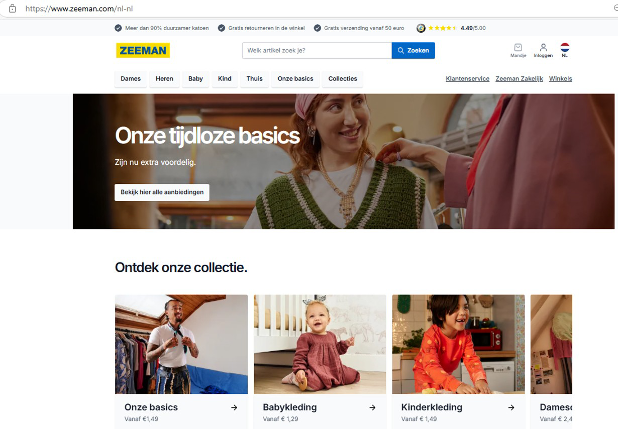 Zeeman is een toonaangevende Europese retailer die zich richt op betaalbare, hoogwaardige basics en huishoudtextiel. Met 1.335 winkels in 8 landen - waaronder 450 in Nederland - helpt Zeeman jaarlijks zo’n 70 miljoen klanten. Het bedrijf biedt kleding voor alle leeftijden, ondergoed, sokken, huishoudtextiel en babyproducten. Duurzaamheid is een kernwaarde, waarbij Zeeman prioriteit geeft aan gerecyclede materialen en ethische arbeidspraktijken.